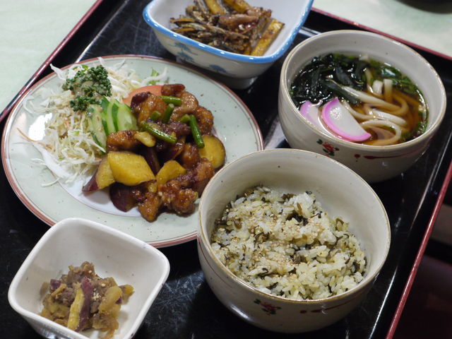 サツマイモのゴロッと炒め、カッラ芋の佃煮、たかな飯、ミニうどん、