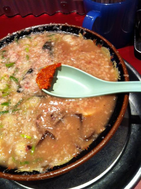 スープの味はレンゲに赤いのが乗ってますので必ず違うレンゲで麺と混ぜる前に味わって下さい。