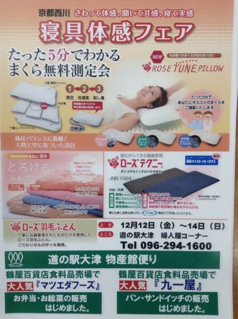 2014年12月12日 まくらの測定会開催してますよ〜。。。 こんばんは、 今日から日曜日(14日まで)まで開催してますよ。 測定だけでもオッケーなのでお気軽の体験してください。 1日平均8時間睡眠するなら 1日の1/3をまくらと共に過ごしてる訳ですから…… 自分に合ったまくらの購入をしてみませんか? 案内板も設置してます。 暖か〜い不思議な毛布も有りますよ。 よろしくお願いします。 それでは、、、 タグ :#京都西川#まくら#測定会#大津町#熊本県#イベント#道の駅 「道の駅大津のこと♪」カテゴリの最新記事 < 前の記事次の記事 > コメント このブログにコメントするにはログインが必要です。 さんログアウト この記事には許可ユーザしかコメントができません。 コメントフォーム 名前 コメント 評価する リセット リセット 顔 星 投稿する 情報を記憶 トラックバック