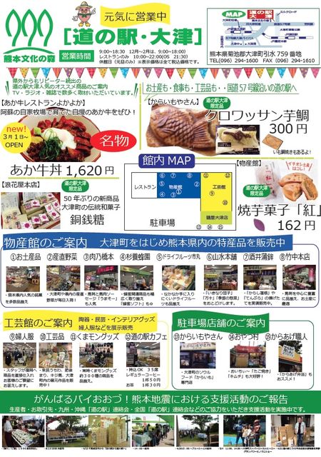 2016年05月21日 2016.05.21 道の駅大津営業中です! こんにちは、道の駅大津は営業中です!営業していることをアピールするためにチラシを作成しています。ショップ内は全店舗元気に営業しています。 タグ :#道の駅大津#チラシ#お昼#からいも#大津町 「道の駅大津のこと♪」カテゴリの最新記事 < 前の記事次の記事 > コメント このブログにコメントするにはログインが必要です。 さんログアウト この記事には許可ユーザしかコメントができません。 コメントフォーム 名前 コメント 評価する リセット リセット 顔 星 投稿する 情報を記憶 トラックバック