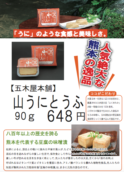 2016年12月08日 216.12.08 山うに豆腐販売しています。しかも柚子味半額! おはようございます。 寒くなってきましたね〜 寒さに負けず。 今週初更新〜 からいもの里道の駅大津の怪しい者です。 今日は、物産館でお買得品を発見しましたのでご紹介! 子守歌の里、五木村のソウルフード「山うにとうふ」です。 豆腐なのにチーズみたいでお酒のアテに丁度いいです。 年間を通して販売中です! お買得品はこれ! 山うにとうふ柚子味〜 何と!半額セール中です! ぜひ、この機会をご利用ください。 ではまた! タグ :#山うにとうふ#五木村#道の駅大津 カテゴリなしの他の記事 < 前の記事次の記事 > コメント このブログにコメントするにはログインが必要です。 さんログアウト この記事には許可ユーザしかコメントができません。 コメントフォーム 名前 コメント 評価する リセット リセット 顔 星 投稿する 情報を記憶 トラックバック