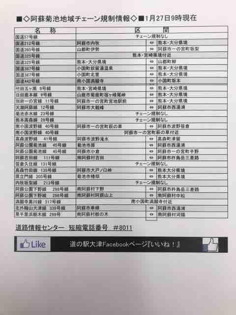 2日連続で阿蘇地域は、チェーン規制が発表されています。