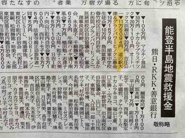 本日、熊本日日新聞で、能登半島地震救援金の掲載がありました。
