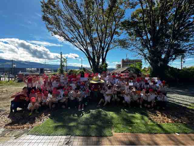 [からいも(サツマイモ)の出荷式]は、地元の大津小学校3年生の皆さんとからいもくんとで盛り上がりました。